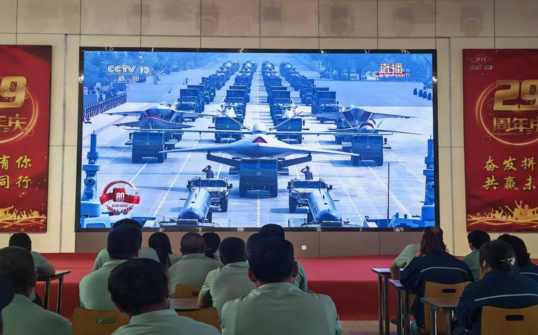 員工們?nèi)褙炞ⅲJ(rèn)真聆聽中共中央總書記、國家主席、中央軍委主席習(xí)近平的重要講話。“正義必勝、和平必勝、人民必勝”的鏗鏘宣言,讓大家感受到磅礴力量,民族自豪感和愛國之情油然而生。